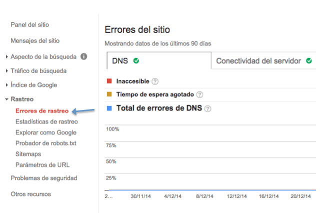 - Enlaces rotos: uno de los factores que nos puede perjudicar en nuestro posicionamiento son los enlaces rotos, es decir, aquellos que llevan a páginas que no funcionan o que ya no existen. Esto se podría traducir en una bajada de posiciones de cara a los buscadores. Una de las mejores herramientas para tratar este tipo de problema no es otra que Webmaster Tools. Para ello accedemos a la Pestaña «Rastreo > Errores de rastreo» y desde aquí corregimos los enlaces rotos que tengamos tal y como mostramos en la siguiente imagen.