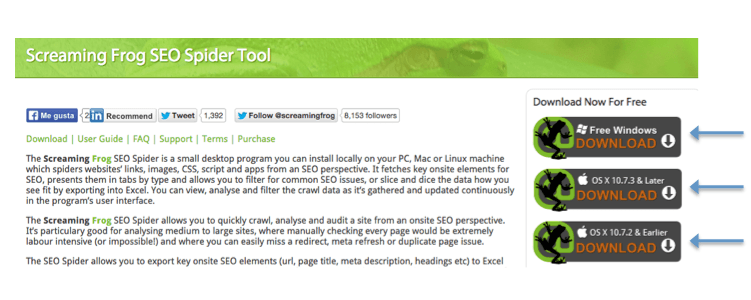 Otro de los programas conocidos en las auditorías SEO es el Screaming Frog un programa muy útil y que al igual que el website auditor nos permite analizar diversos factores como pueden ser: Errores tipo 4XX y 5XX , páginas duplicadas, title duplicados, páginas no indexadas, etiquetas h1,h2 en adelante, etc. El screaming frog nos da la posibilidad de descargarnos una versión gratuita en función del sistema operativo que tengamos tal y como muestra la siguiente imagen.