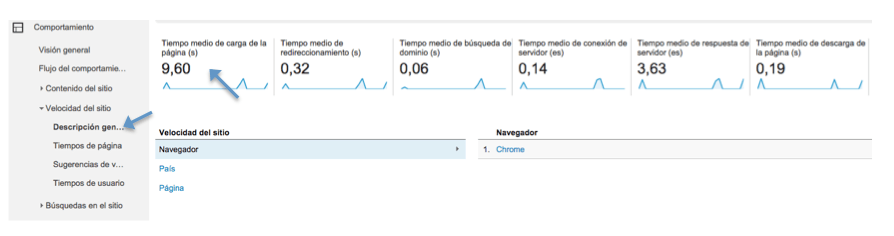 Google establece que aquellas páginas cuya puntuación sea menor o igual a 60 son páginas relativamente lentas mientras que las páginas con una puntuación superior a 80 son páginas con una muy buena velocidad de carga. Para aquellos que prefiráis verlo por Google Analytics tendréis que acceder a «Comportamiento > Velocidad del sitio» y desde ahí visualizar el tiempo medio de carga de la página, tiempo medio de redireccionamiento, tiempo medio de búsqueda del dominio, tiempo medio de conexión del servidor, tiempo medio de respuesta del servidor, tiempo medio de descarga de la página. Tened en cuenta que si el tiempo medio de carga de una página es más de 4 segundos es considerada por Google como una página muy lenta. A continuación os mostramos donde poder ver esta información desde el panel de control de Google Analytics.