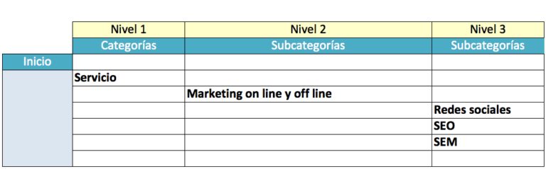 - Estructura web: a la hora de analizar la estructura de nuestro site debemos de saber de cuántos niveles se compone. Cuando hablamos de niveles nos referimos a cuantos clic necesita realizar el usuario hasta llegar a la última página de la web. Tal y como os mostramos en la imagen siguiente esta web dispone de 3 niveles, por lo que si el usuario quiere llegar hasta la subcategoría de redes sociales necesitará realizar tres clic hasta llegar al lugar que desea.