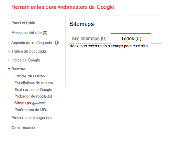 - Comprobar que nuestra web este bien indexada (Webmaster tools): este proceso es muy importante, pues es lo único que puede hacer que nuestra web aparezca en Google o en cualquier otro buscador, ya que toda página que el robot de Google no rastree y por consiguiente no indexe no va a aparecer en los resultados. Para que este no nos ocurra es aconsejable que creemos un sitemap (archivo xml en el que le dices a google que páginas quieres que te indexe) y subirlo a webmaster tools para que Google las rastree y empiece su indexación. Es importante que sepáis que los sitemaps NO son de obligado cumplimiento para los buscadores, sino que son una sugerencia que podrán seguir o no. Para subir un sitemap, tan solo tenéis que seguir la ruta que os indicamos a continuación:
