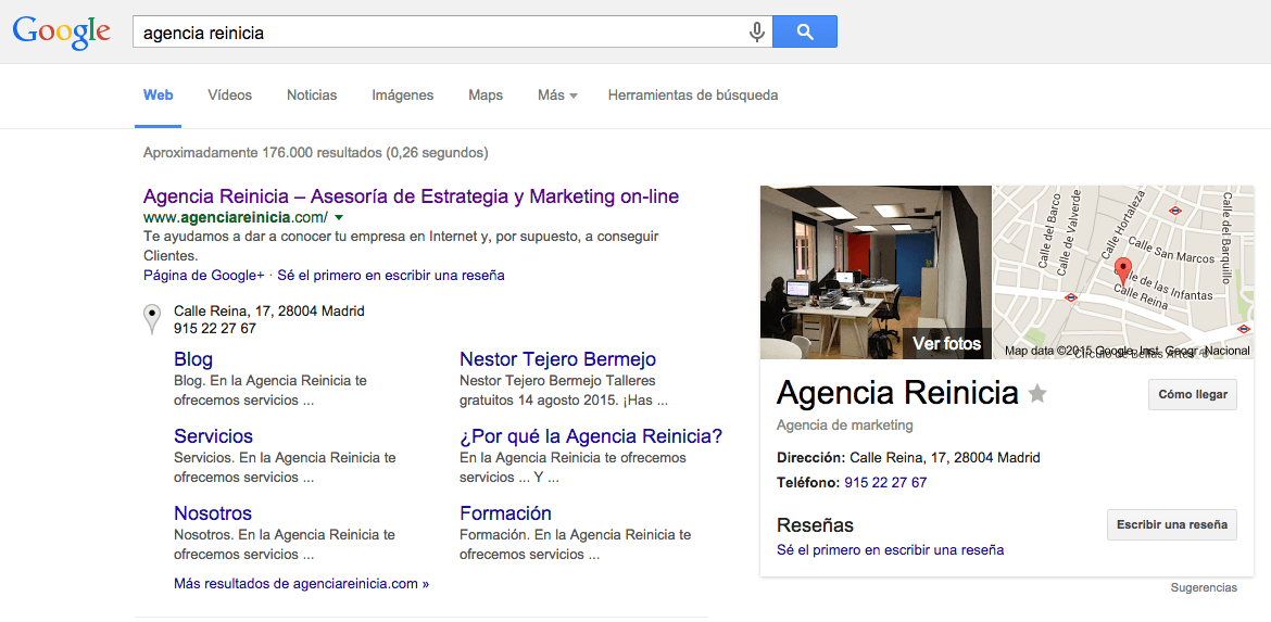 Una de las formas más básicas de sacar provecho a esta red social en los resultados de búsqueda es crear una página de Google Plus y enlazarla con Google My Business. De esta forma, cada vez que alguien busque tu negocio, en la parte derecha de los resultados de búsqueda podrán aparecer tus datos de forma más visible: