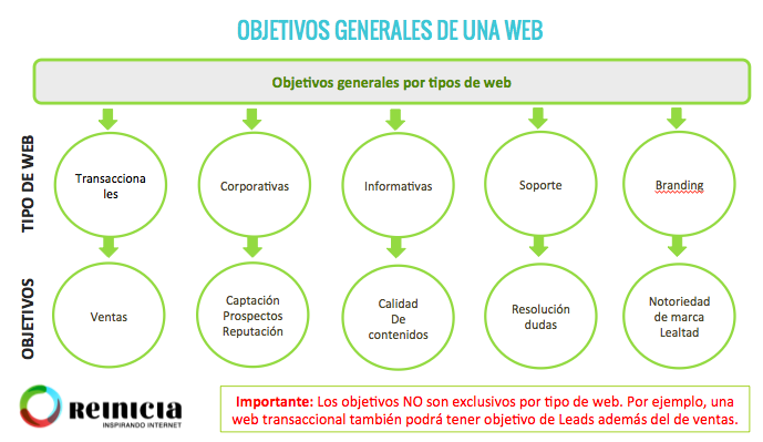 Poner en marcha miles de herramientas que te ayudarán a hacer marketing no tiene sentido si no controlas los resultados de lo que haces para ir mejorando y potenciando lo que si funciona y dejar de hacer lo que no. Cuando pongas en marcha el Blog, deberás pensar muy bien cuáles son los objetivos que persigues con el mismo: imagen de marca, ya sea de la empresa o personal, ventas, contactos, acceso a determinados círculos del sector, visitas a la web o tienda on-line, etc. En función de ello, deberás controlar unos indicadores u otros. En el gráfico que aparece a continuación podrás ver algunos ejemplos de objetivos en base al tipo de web: