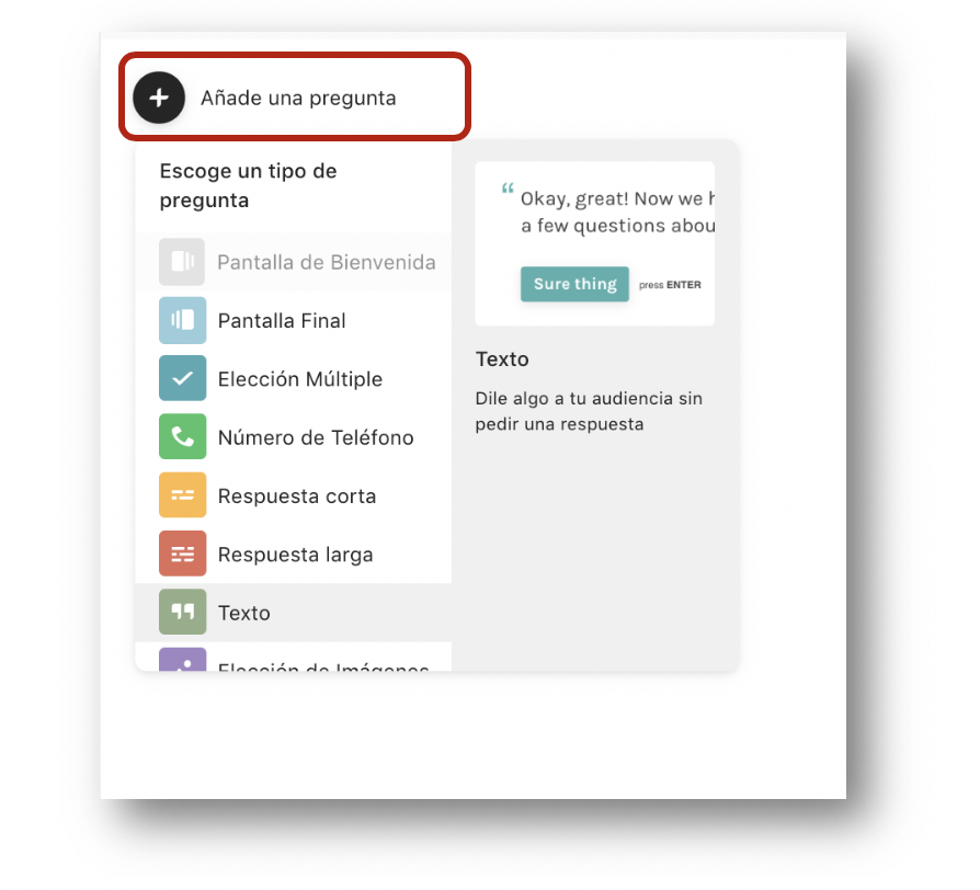 Cuando lo que necesitas es añadir algo, pero no esperas una respuesta por parte de tus encuestados, debes utilizar este tipo. Te permite añadir una frase o un mensaje inspirador y es idóneo para hacer una pequeña aclaración a nuestros contactos.