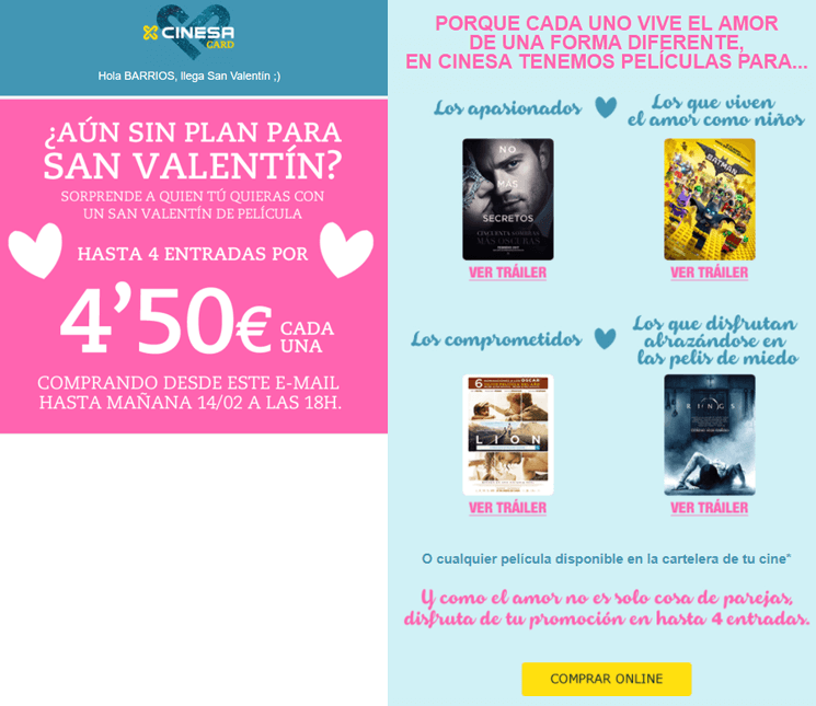 Cinesa apuesta por el envío de su catálogo de últimos estrenos con un súper precio para motivar la compra: