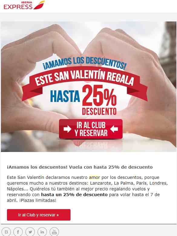 Debes poner extra de cariño en tu línea de asunto, pero sobre todo asegurarte de dejar claro que es una promoción especial para el Día de San Valentín. Utiliza palabras como «Cupido», «amor», «perfecto», «ideal» o «regalo» para hacer énfasis, puede ayudar a aumentar el CTR de tu campaña. Algunos posibles asuntos pueden ser: