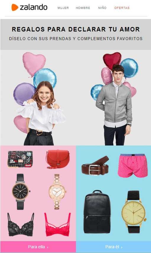 No te detengas ahí. Puedes hacer que tus newsletter del día de San Valentín sean aún más atractivas apelando a uno de tus segmentos clave (por ejemplo, hombres o mujeres) como hizo Zalando.