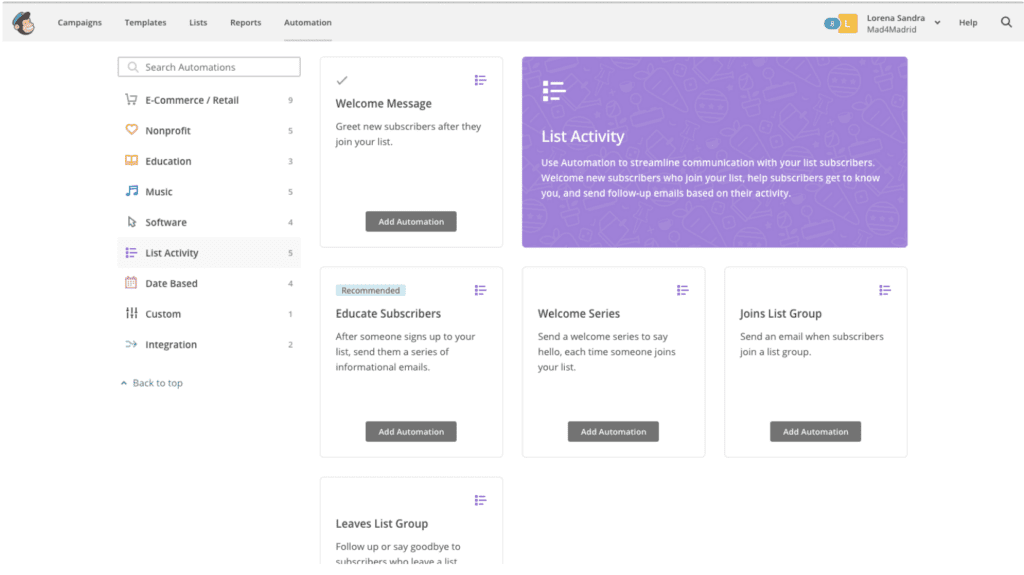 Mailchimp, aunque también funciona como CRM, es más conocido por su enfoque en automatizaciones de email marketing. Permite crear campañas de correo electrónico segmentadas, además de desarrollar flujos de trabajo automatizados basados en el comportamiento del cliente, asegurando así un marketing más personalizado: