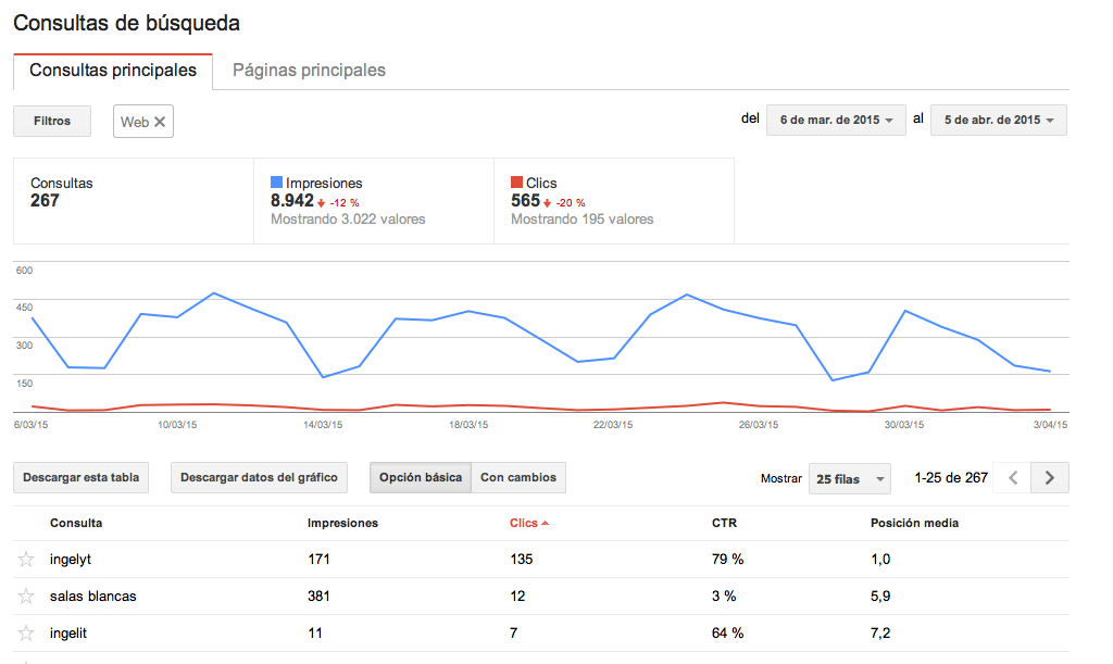 Creenos cuando te decimos que nos encanta esta pestaña. Por un lado, podrás encontrar las palabras para las cuales tu sitio aparece en los resultados de búsqueda de Google y los clics que estás teniendo. ¿No es genial? Podrás saber rapidamente para que palabras clave estás posicionando y qué porcentaje de clics te estás llevando. La mala noticia es que estos resultados son medias y podrían diferir de las posiciones que saques con alguna herramienta de SEO o haciendo búsquedas manualmente, ya sea en modo personalizado o de incógnito. Podéis tener más información sobre este asunto en un artículo de Moz.