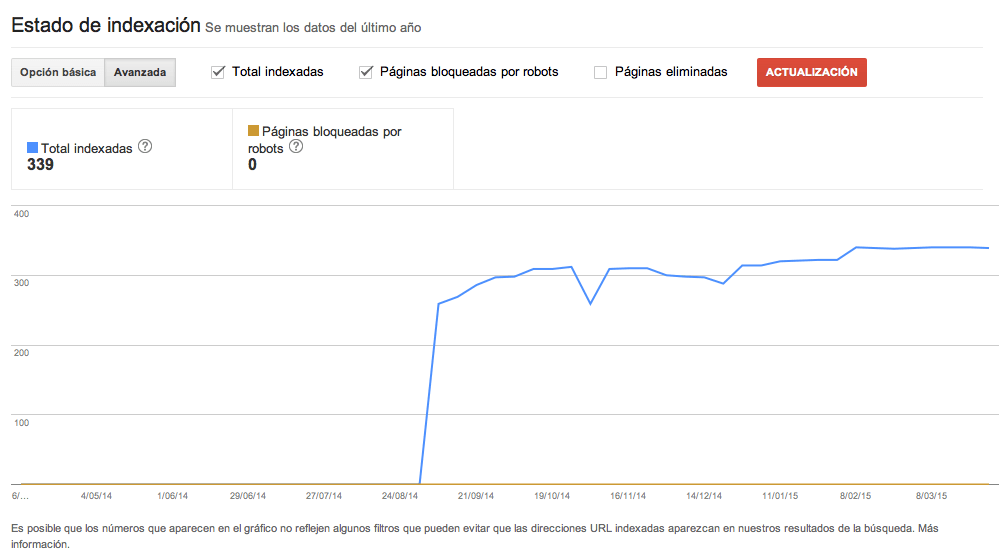 ¿Cuántas páginas dice Google que tiene indexadas de nuestra web? ¿Hay muchas diferencias con respecto al total de páginas de que consta nuestro sitio? Podría ser que Google no esté rastreando correctamente nuestro sitio o peor, que haciéndolo, decida que meter determinadas páginas en su índice no aportará nada útil a sus usuarios. Es importante que periódicamente comparemos el número de páginas que realmente tiene nuestro sitio con las que Google dice tener indexadas. Habrá que trabajar para que el porcentaje sea lo mayor posible.