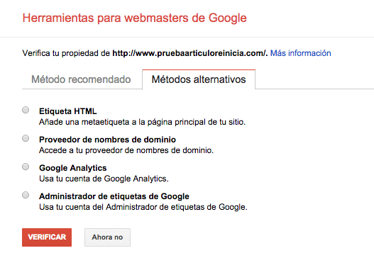 A partir de aquí, tendrás que seguir alguno de los 5 métodos de validación que Google ha habilitado para demostrar que eres el propietario o que por lo menos tienes acceso a la web. En general, nosotros solemos usamos el método de subir un archivo HTML a la raíz del dominio vía FTP. Cualquier diseñador / desarrollador web podrá ayudarte si no tienes conocimientos técnicos. Sino, en caso de utilizar la misma cuenta para GWT y para Google Analytics, entre los métodos alternativos se permite validarlo conectando ambas cuentas, en cuyo caso, no necesitarás ningún fichero ni soporte técnico ;]