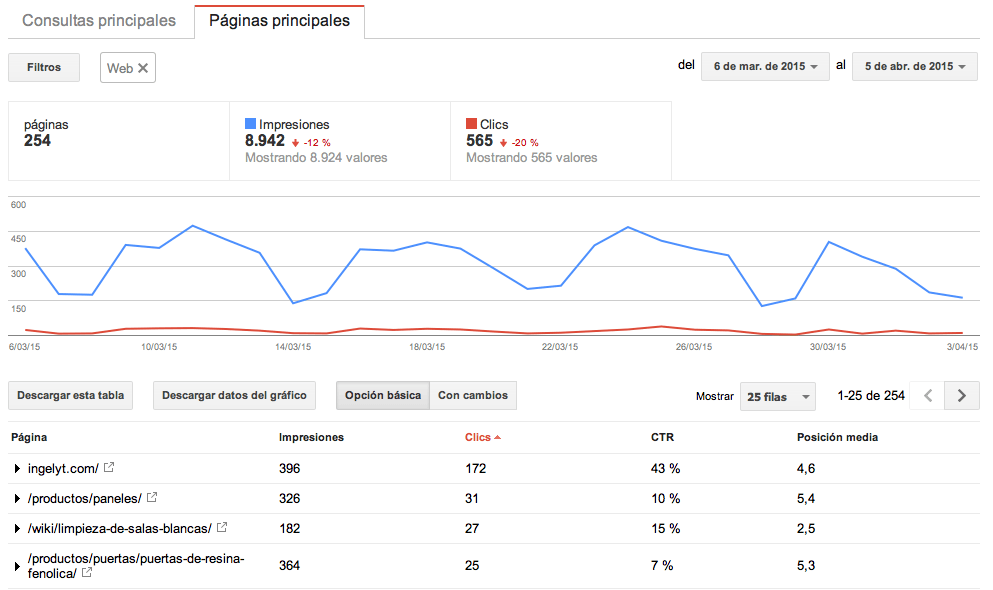 Por otro lado, podrás ver las páginas de aterrizaje más importantes a las que llegan los Usuarios cuando aterrizan en tu web desde los buscadores. Increíble, ¿verdad? Podrás ver cuáles son las que generan más clics y podrás trabajar sobre ellas para conseguir mejores resultados para tu negocio. Lo mismo puedes meter algún botón de llamada a la acción nuevo o insertar un banner con alguna promoción y ver si cambian estos datos.