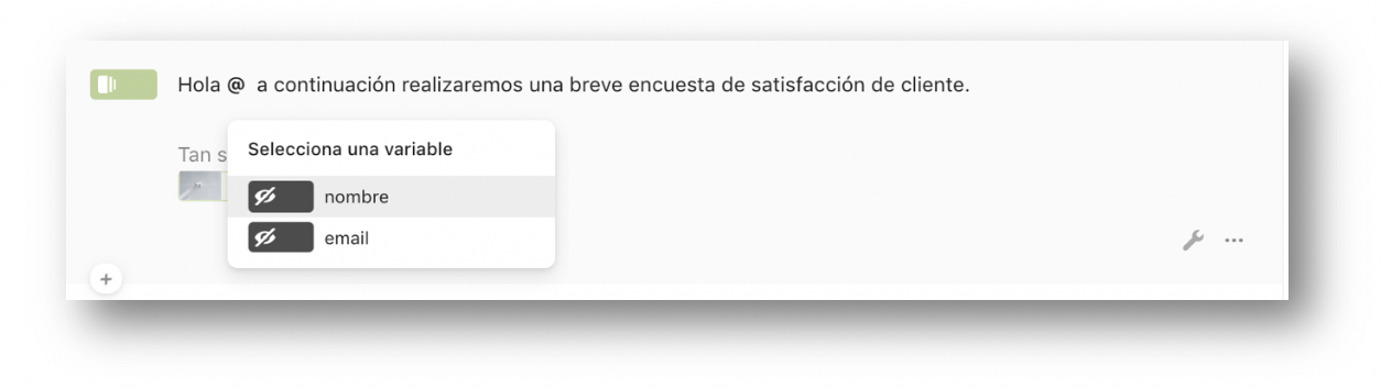 Tal como vemos en la primera pantalla de bienvenida al escribir “@” se despliegan nuestros campos. Seleccionamos nombre.