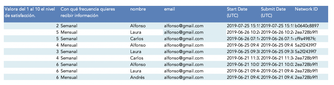En el Apartado Campos ocultos tenemos todas las respuestas vinculadas a cada uno de los emails que hayan rellenado el formulario.