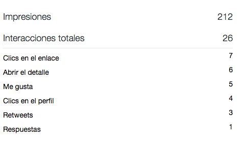 En cuanto a los Me gusta de Twitter se pueden consultar en Twitter Analytics. Solo hay que abrir la pestaña superior de Tweets y clicar sobre cada uno de ellos para obtener un resumen detallado con el número de Me gusta entre otros datos. También dentro de este apartado, en la columna derecha de Interacciones, encontrará un gráfico de barras de color amarillo con el número de Me gusta por día.