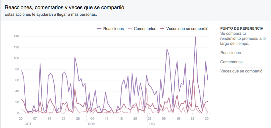 Esta sugerencia ha sido atendida por el equipo de Mark Zuckerberg y llevada más allá. Ya no solo puede gustar una publicación a los usuarios sino que puede encantar, asombrar, divertir, entristecer y enojar. Los botones llamados Reacciones han sido muy bien aceptados por el público en general, que los empezó a emplear desde el primer momento aunque los datos no se han disparado en líneas generales. El nivel de interacción ha subido pero no alcanza cifras destacables que sean estadísticamente relevantes, como por ejemplo, duplicar los Me gusta, etc. Como se puede observar en este gráfico que muestra las reacciones desde octubre, poco antes de que las reacciones llegaran a Facebook y hasta el 30 de diciembre de 2015, lo más destacable es que la interacción es más constante con algunos picos en fechas concretas.