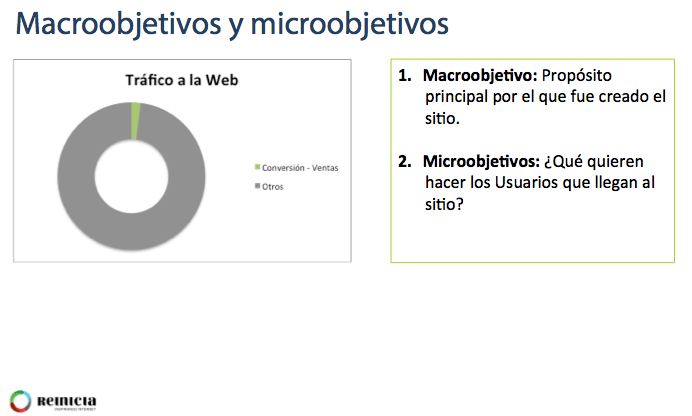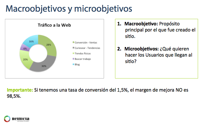 Para poder determinar qué es prioritario en cada página de tu web, lo fundamental es tener claros los objetivos de negocio que persigues y a partir de ahí, determinar a qué objetivo está enfocada cada página. Y no nos referimos sólo al macroobjetivo, sino también a los microobjetivos como podrían ser registros de usuarios, descargas, atención al cliente o visitas a determinadas secciones de la web. Si no estás familiarizado con los macroobjetivos y microobjetivos de una web, te recomendamos leer nuestro artículo al respecto.