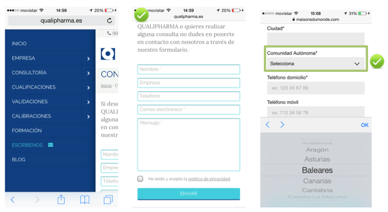 - Uso de desplegables y casillas de verificación para selecciones múltiples. Eso si, cuidado con el tamaño y la distancia entre casillas para que el visitante no se confunda al pulsarlas.