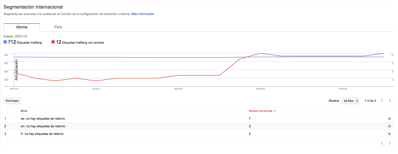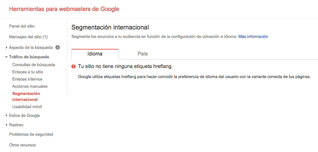 Una vez hechos estos cambios, podremos comprobar que el código está correctamente implementado y que Google está recibiendo la información accediendo a nuestra cuenta de Google Webmaster Tools para este dominio. Bajo el epígrafe «Tráfico de búsqueda > Segmentación internacional«, podremos ver estos datos:
