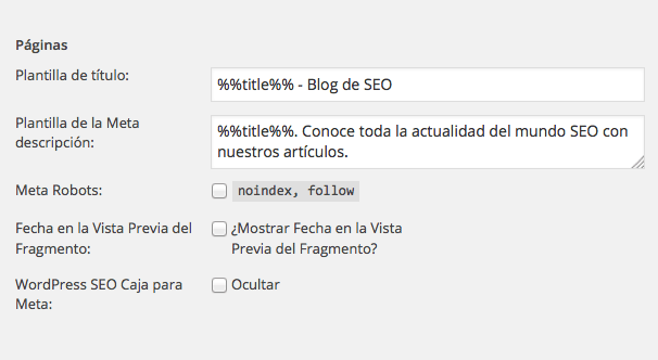 • Tipo de entrada: En este apartado podemos configurar patrones generales con los cuales se van a generar los titles y meta descriptions de TODAS las páginas de la web, definiéndolo para cada tipo de entrada que tengáis configurado. En el campo Plantilla de título pondremos el title que queremos que tenga por defecto nuestra entrada y lo mismo ocurre con la plantilla de la meta descripción. Los otros 3 checks los deberías de tener sin seleccionar, para que por defecto se indexe toda la información. A Continuación os mostramos un ejemplo de como quedaría con las variables que nosotros hemos definido para uno de nuestros sitios.
