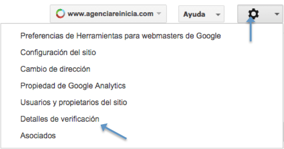 Para obtener este código tendréis que ir a vuestro webmaster tools hacer clic en la cuenta que habéis dado de alta y en panel de sitio ir al icono que aparece en la parte superior derecha en forma de «tuerca», desplegar el menú y pinchar en detalles de verificación. Dentro de detalles obtendremos el código que insertaremos en el wordpress tal y como aparece en la imagen superior.