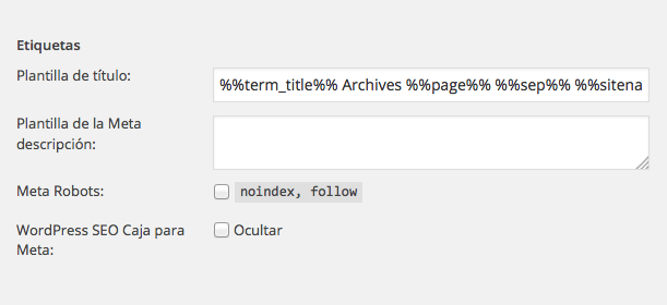 • Taxonomías: en esta pestaña vienen el resto de los tipos de elementos primarios de nuestro sitio como pueden ser categorías, etiquetas, formatos, wiki, etc. Al igual que en tipo de entradas podemos definir mediantes variables los title y las meta description. A continuación os mostramos un ejemplo de como hemos definido esta etiqueta.