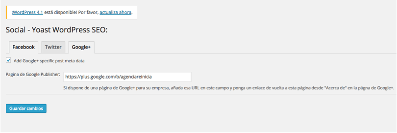 Las redes sociales cada vez tienen un mayor peso en el SEO, por lo que desde este plugin nos permite llevar a cabo una configuración rápida y sencilla de algunas cuestiones que podrían ser beneficiosas para el sitio. Desde esta pestaña podremos definir la manera en la que queremos que los usuarios puedan compartir los contenidos en Facebook, Twitter como en Google+. De esta forma, podremos sugerir textos que aparecerán cuando la gente que comparte una página de nuestro sitio, pegue la URL en alguna de estas redes.