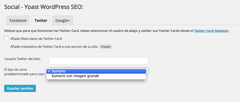 Meta datos de Twitter Card: para quienes no lo sepan un Twitter Card es toda aquella información que aparece cuando publicamos tuits. Seleccionando esta opción lo que estamos consiguiendo es que en cada tuits que nosotros publiquemos aparezca una información que previamente se ha aprobado mediante la introducción de nuestro nombre de usuario que hemos insertado en la casilla Usuario Twitter del sitio y seguidamente haber seleccionado alguna de las dos opciones que nos dan en la casilla Tipo de carta predeterminado para usar, las dos opciones que nos da esta casilla son: